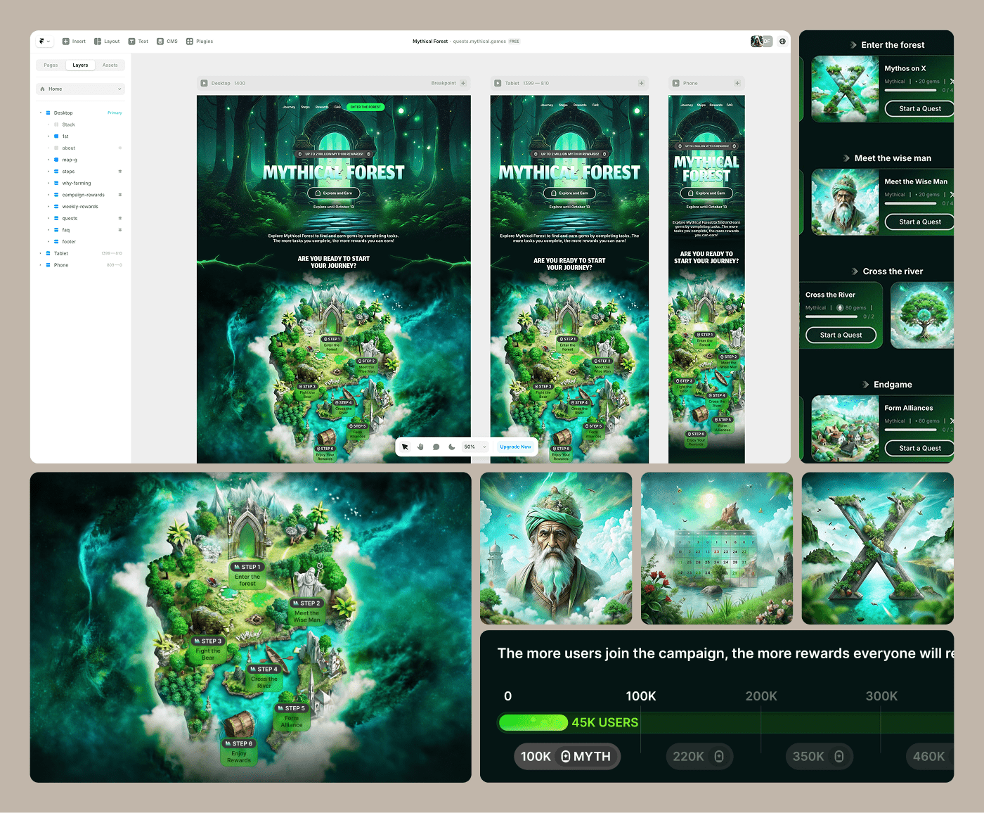 Built a full campaign world from scratch — quest map, assets, characters, UI states. All visuals handcrafted, fully responsive, and shipped in Framer. Feels like a game, works like a funnel.