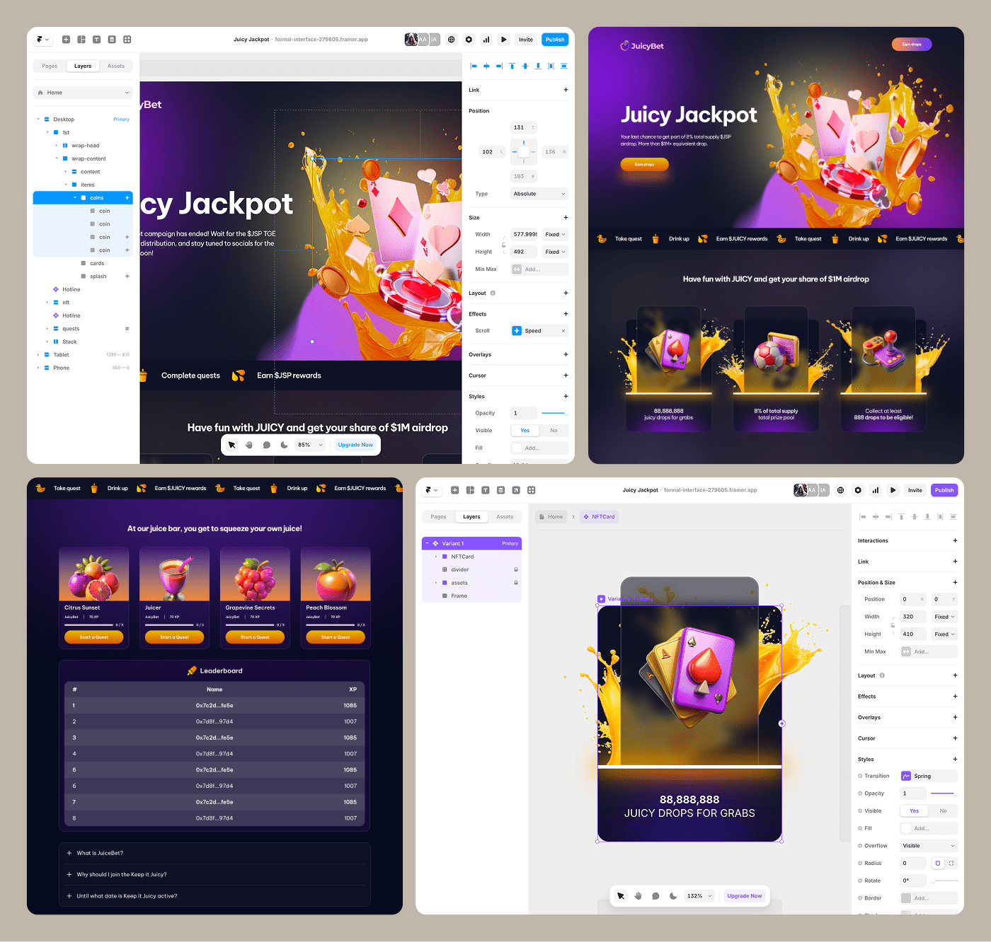 Crafted a vibrant campaign hub with rich visuals, quest mechanics, custom leaderboard, and dynamic states. Everything built in Framer — smooth, fun, and ready to squeeze 🍑