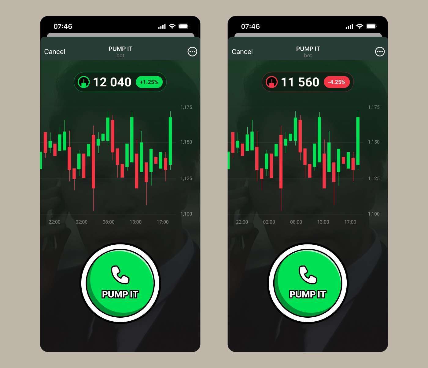 Here's a concept with two states — pump and drop. Trading-style chart, live numbers, and a bold “PUMP IT” button. Designed to feel native in Telegram.