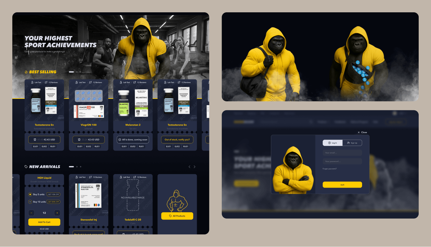 Sure! Created a gorilla mascot with a signature yellow hoodie — looks powerful and memorable. Adapted it for hero banners, product cards, login screen, and call-to-action blocks.