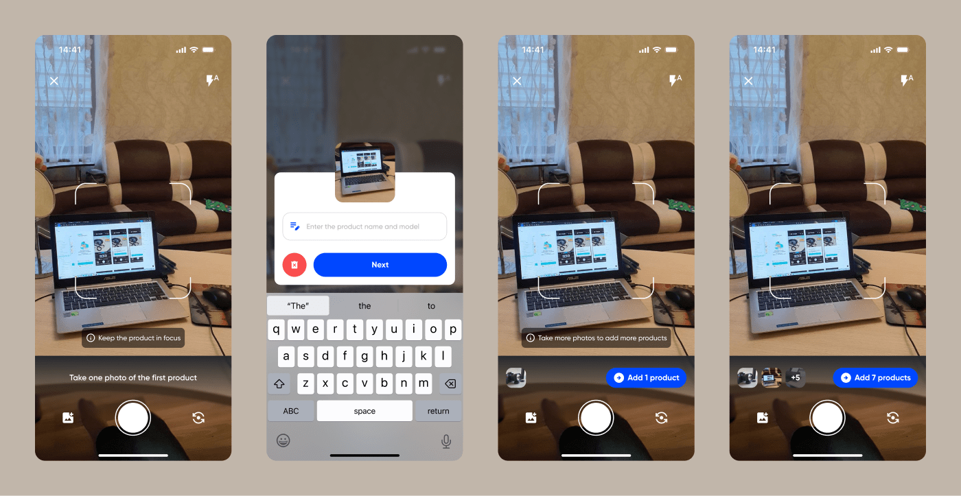 Designed a flow where users stay in the camera view the whole time. Each shot adds a product, quick label input, and back to snapping — smooth, fast, zero friction!