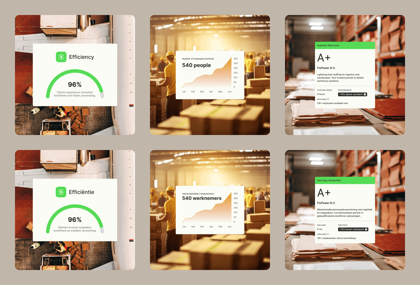 Turned boring into bold. Designed a set of branded stat cards with clean UI and strong data cues — efficiency, scale, speed. Feels like a product, not just a service. Ready for both EN and NL use.